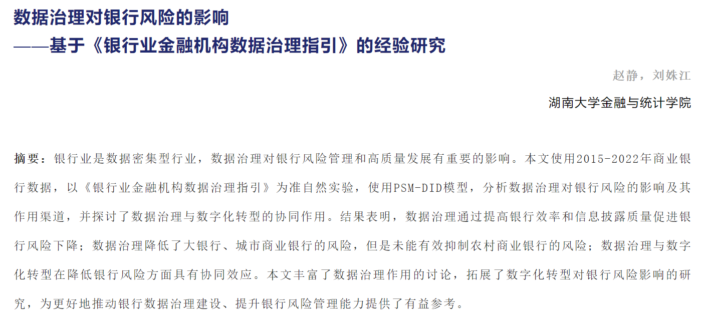 近日,五楼自拍 应用金融系赵静副教授和2022级硕士研究生刘姝江合作的题为“数据治理对银行风险的影响——基于《银行业金融机构数据治理指引》的经验研究”的论文发表在《金融研究》2025年第2期。