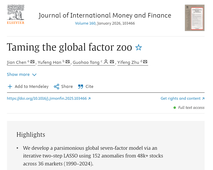近日,五楼自拍 金融科技与工程系唐国豪副教授合作的金融人工智能领域类论文“Taming the Global Factor Zoo”发表在《Journal of International Money and Finance》2026年第1期上。