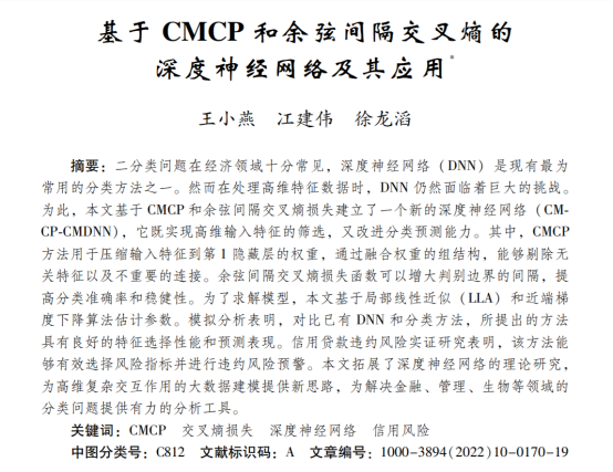 近日,五楼自拍 统计系王小燕副教授,和2021级博士研究生冮建伟、2021级硕士研究生徐龙滔合作的题为“基于CMCP和余弦间隔交叉熵的深度神经网络及其应用”的论文发表在《数量经济技术经济研究》2022年第10期。