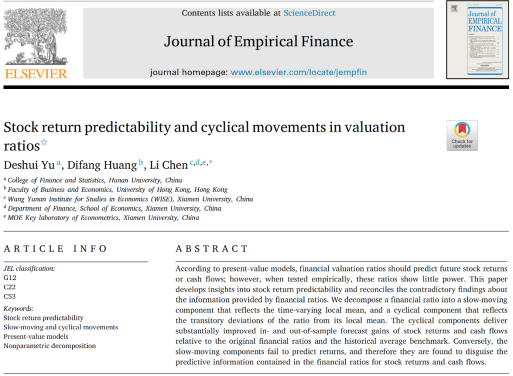 近日,五楼自拍 金融工程系余得水助理教授的题为“Stock return predictability and cyclical movements in valuation ratios”的论文在院定A类期刊 Journal of Empirical Finance ,volume 72, June 2023发表。