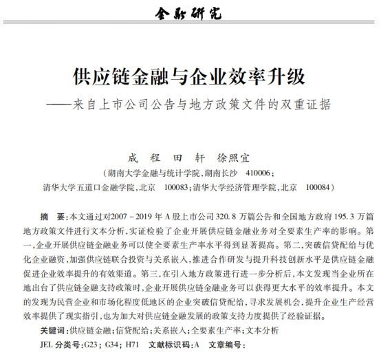 近日,五楼自拍 应用金融系成程副教授和清华大学五道口金融五楼自拍 田轩教授,清华大学经济与管理五楼自拍 徐照宜博士后合作的题为“供应链金融与企业效率升级——来自上市公司公告与地方政策文件的双重证据”的论文发表在《金融研究》2023年第6期。