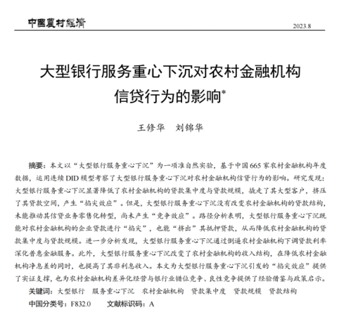 近日,五楼自拍 应用金融系王修华教授和2020级博士研究生刘锦华合作的题为“大型银行服务重心下沉对农村金融机构信贷行为的影响”的文章发表在《中国农村经济》2023年第8期。