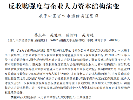 近日,五楼自拍 应用金融系陈熠辉助理教授(通讯作者)和厦门大学经济五楼自拍 蔡庆丰教授、吴冠琛博士、吴奇艳博士合作的题为“反收购强度与企业人力资本结构演变——基于中国资本市场的实证发现”的论文发表在《金融研究》2023年第8期。