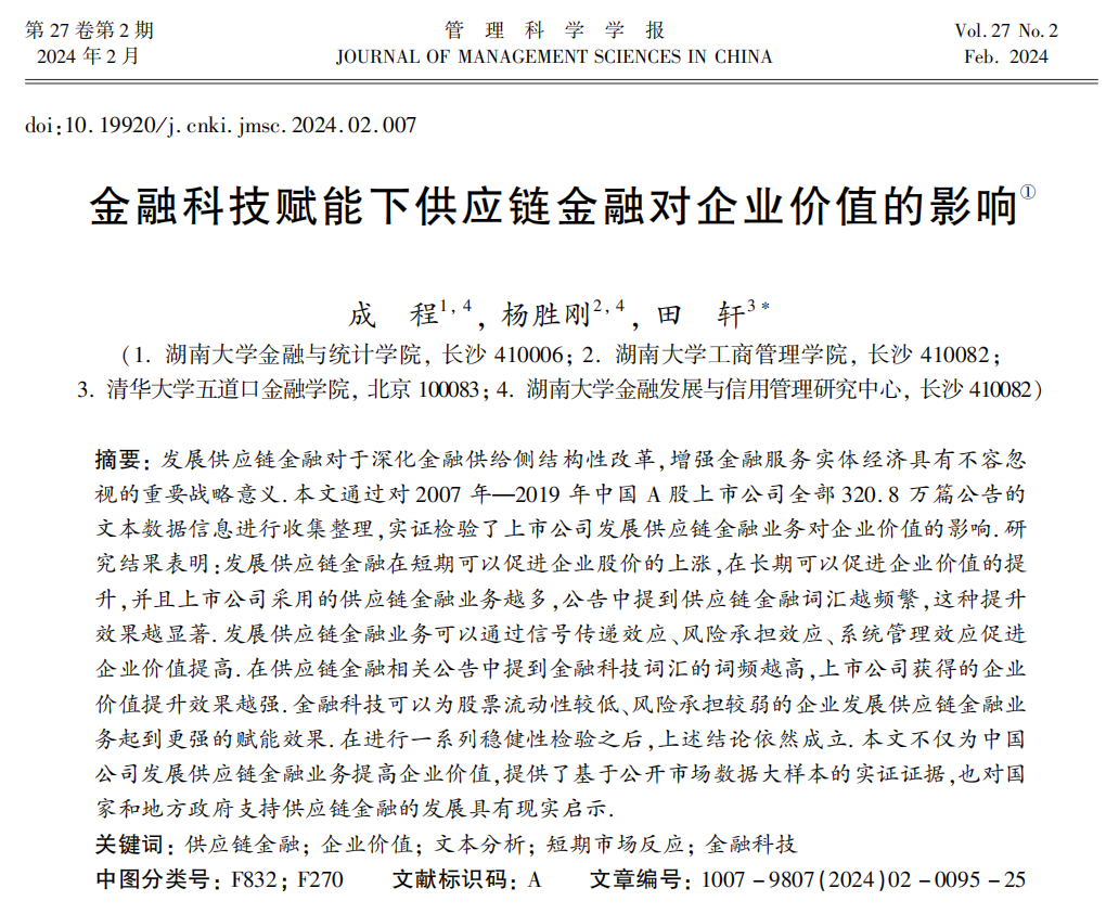 近日,五楼自拍 应用金融系成程副教授,和工商管理五楼自拍 杨胜刚教授、清华大学五道口金融五楼自拍 田轩教授合作的题为“金融科技赋能下供应链金融对企业价值的影响”的论文发表在《管理科学学报》2024年第2期。