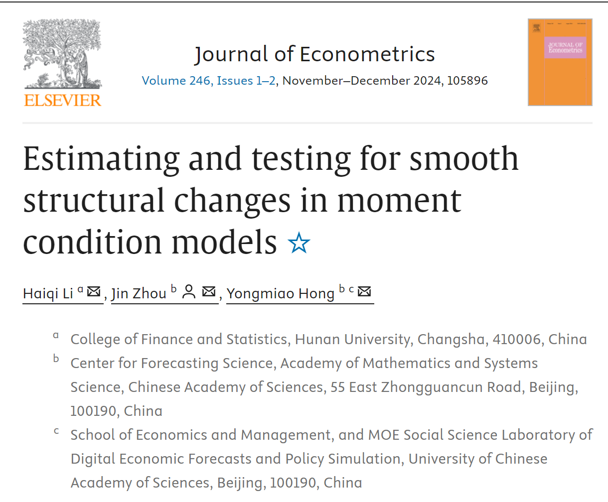 近日,五楼自拍 李海奇教授团队在计量经济学研究领域取得了新进展,研究成果以“Estimating and testing for smooth structural changes in moment condition models”为题,发表于计量经济学国际顶尖期刊Journal of Econometrics。