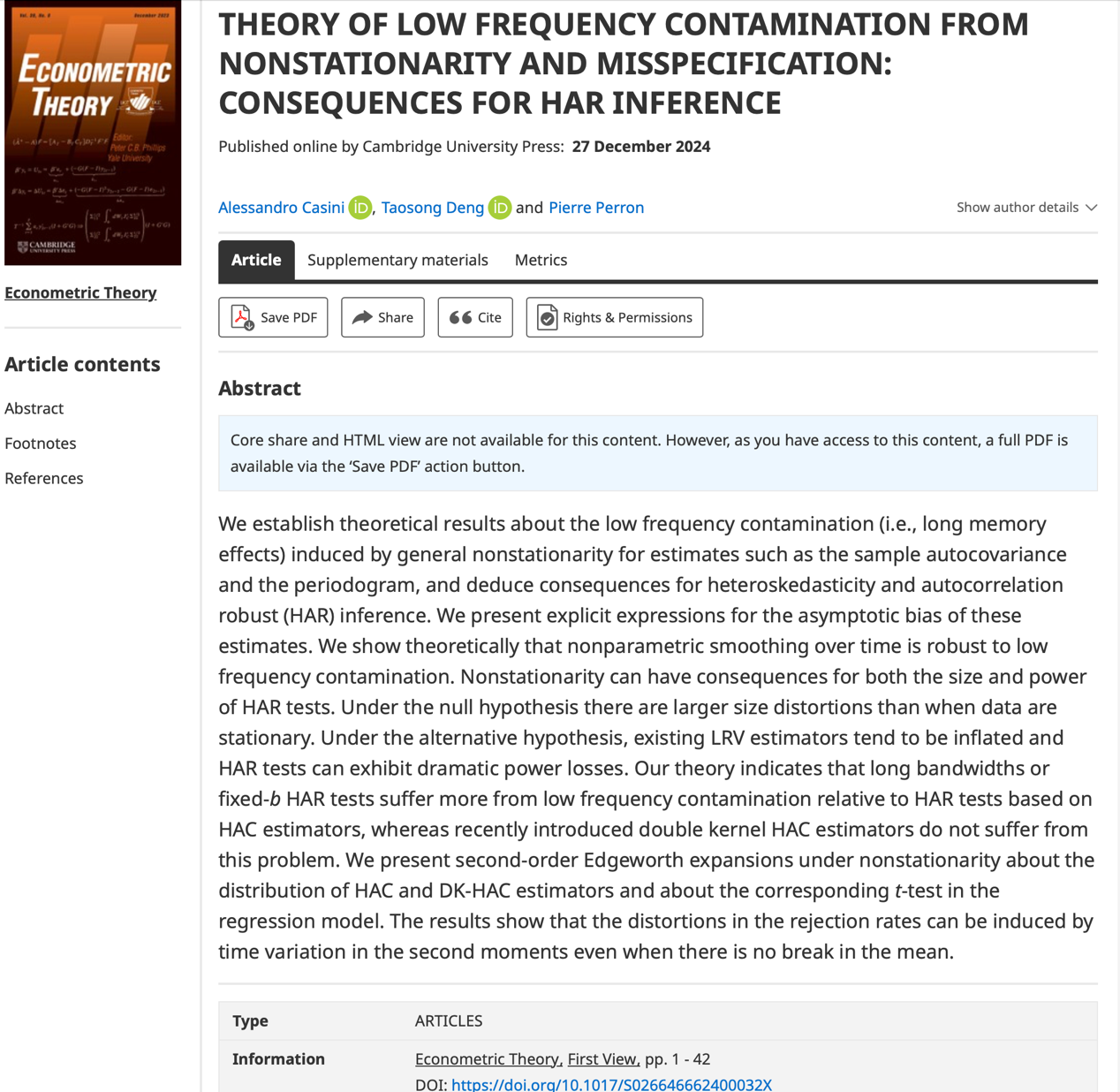 近日,五楼自拍 金融科技与工程系邓滔崧助理教授,与罗马第二大学助理教授Alessandro Casini、波士顿大学教授Pierre Perron合作的题为“Theory of Low Frequency Contamination from Nonstationarity and Misspecification: Consequences for HAR Inference”的论文在《Econometric Theory》线上发表。