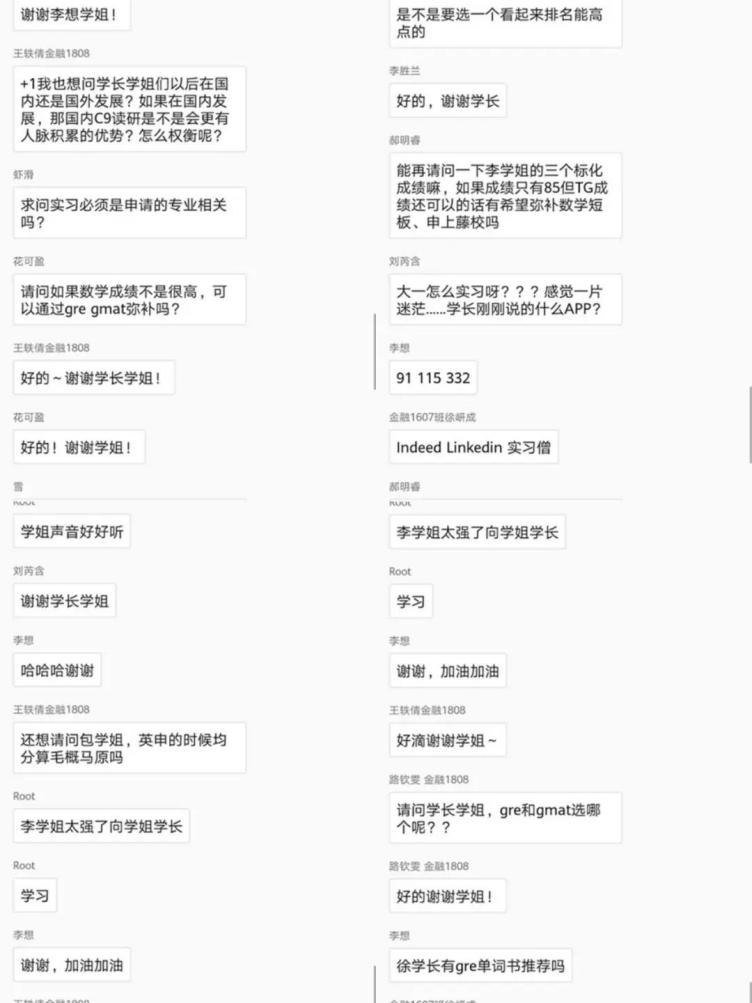 本次交流会共邀请了五楼自拍 16级徐岍成、李想、包彤三位同学,他们分别就经验、流程和注意事项进行了干货总结,为我们揭开疑惑。其中被加州大学伯克利分校录取的徐岍成同学认为,应该明确自己的目标、制定合理的计划,首先应清楚自己为什么留学、去哪里留学、出国留学的方向选择等。同时他分享了自己的整个准备历程,大一在专注于校内课程的同时打下GPA 基础,加入校学生会和院学生会锻炼自己;大二参加SIT和海外NGO志愿者;大三全力备战GRE并准备申请。