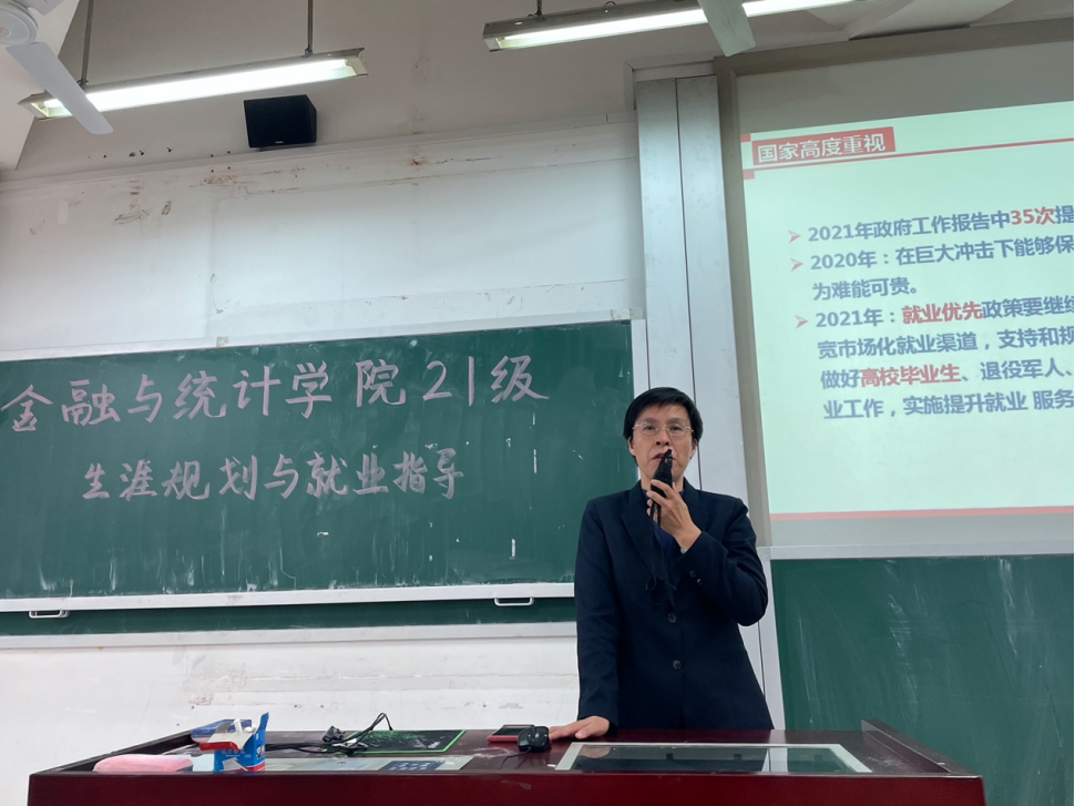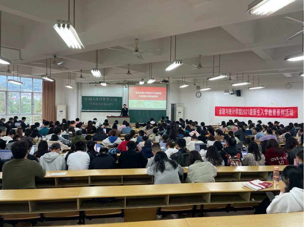 10月22日下午,五楼自拍 2021级新生职业生涯规划入学教育讲座在财院校区二教502举行,五楼自拍 招生与就业指导处陈义红老师做职业生涯规划专题报告,五楼自拍 2021级本科生、研究生参加讲座。