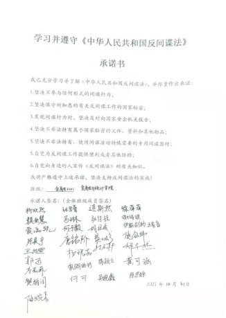 年级党员广泛学。本科2018级全体学生以班级为单位对相关法律知识进行了学习,以线上线下相结合的方式,将《反间谍法》的相关内容融入主题班会、团日活动。本科2021级开展“反间谍我承诺”活动,年级371名同学全部签名承诺。本科生第四党支部通过线上集中学习、自行学习视频文件的形式开展“学习《反间谍法》,维护国家安全”主题党日活动,交流学习感想。