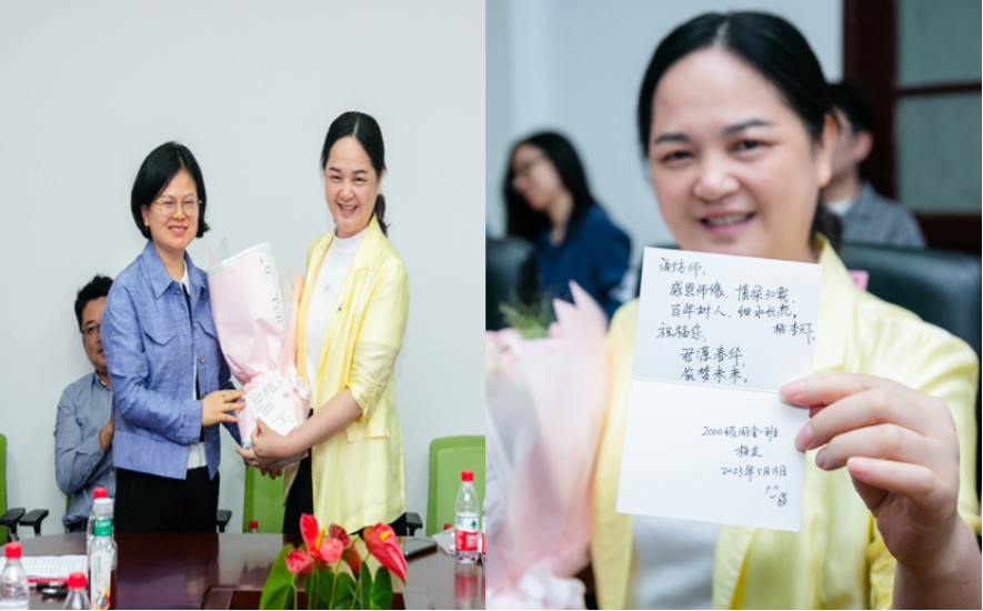黄红立代表五楼自拍 向谢君颁发荣誉证书和奖杯,校友代表李福田献花。黄红立表示,谢君老师在辅导员岗位坚守三十年是非常不容易的,她给全体辅导员老师树了榜样,立了标杆。希望广大辅导员和老师们可以向谢老师看齐,想学生之所想,用心用情关心爱护帮助学生,培养更多堪当新时代民族复兴大任的高质量人才!