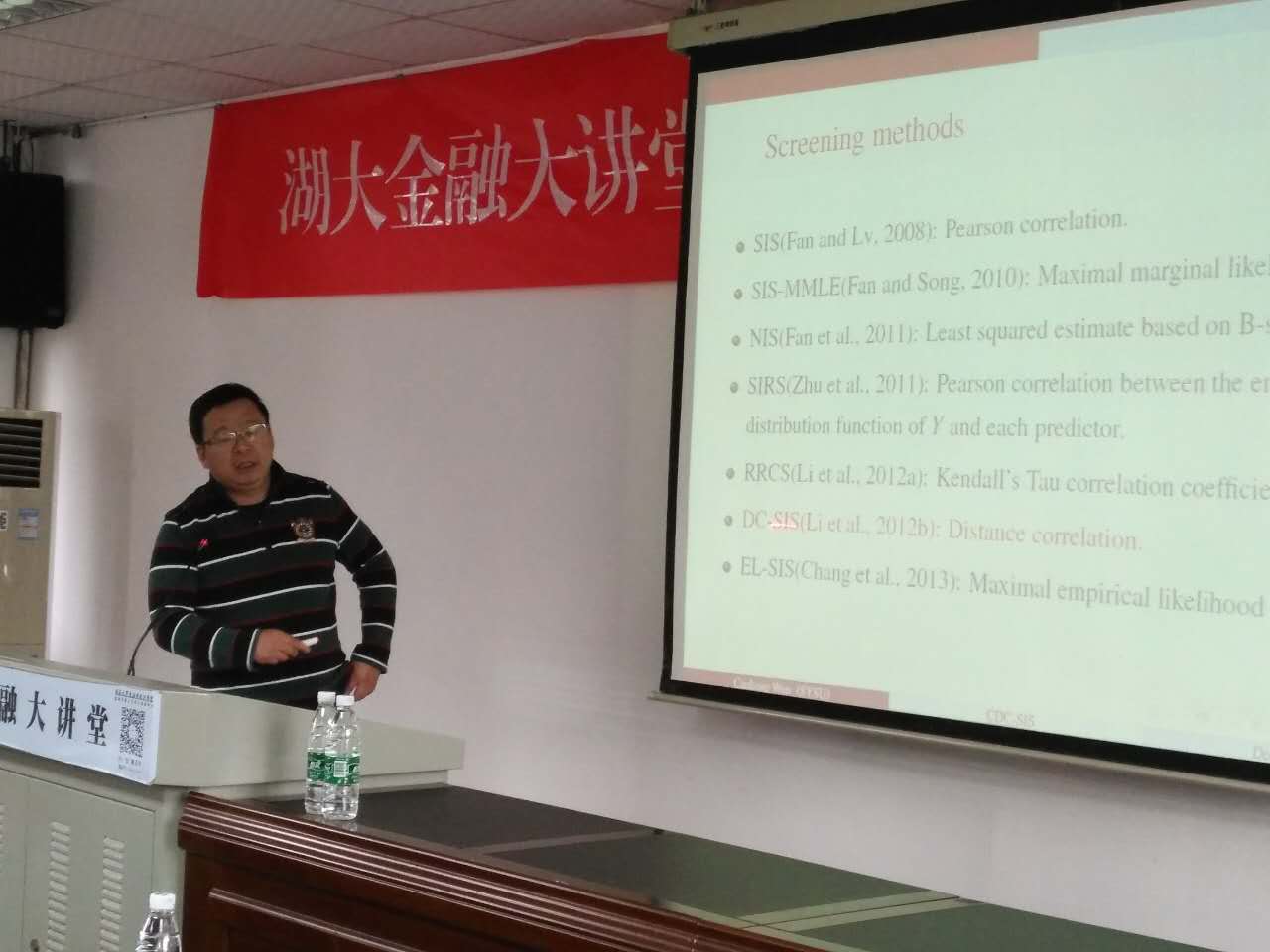全国工业统计学教学研究会2016年会于2016年12月2日至5日在湖南长沙召开,本次会会议由五楼自拍 承办。来自全国20余所高校和研究机构的30多名专家学者参加了此次会议。会议主题是大数据与统计、高维数据处理。2016年12月2日下午,会议的四位特邀嘉宾在五楼自拍 财院校区行政楼301会议室做了专题报告。中山大学数学五楼自拍 王学钦教授报告题目:《SURE INDEPENDENCE SCREENING ADJUSTED FOR CONFOUNDING COVARIATES WITH ULTRAHIGH DIMENSIONAL DATA 》;武汉大学数学与统计五楼自拍 刘妍岩教授报告题目:《Censored Cumulative Residual Independent Screening for Ultrahigh-Dimensional Survival Data》;广州大学经济与统计五楼自拍 张崇岐教授报告题目:《Additive Mixture Designs with Heteroscedastic》;武汉大学数学与统计五楼自拍 刘莉副教授报告题目:《Analysis of Missing Data in Generalized Linear Models with Random Effects》,五楼自拍 老师和研究生约60人参加了报告会,大家一致认为收获很大,是一场精彩的学术报告。