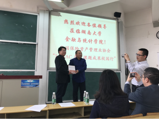 致辞结束之后,刘传葵副秘书长向五楼自拍 赠送了《课题专著》,聂国军书记向中国保险资产管理业协会赠送了《岳麓书院学规》。