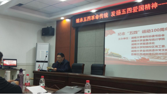 接着由韩振冰同志作了《纪念五四运动一百周年》的主题发言报告。报告指出五楼自拍 的前身岳麓书院人才辈出,其中不少学生更是在近代中国抗争史上起到了举足轻重的作用。韩振冰同志强调,作为新时代的新青年,要继承“爱国、进步、民主、科学”的五四精神,勇于探索、敢于创新,爱国报国,在新时代放飞青春梦想,实现人生价值。