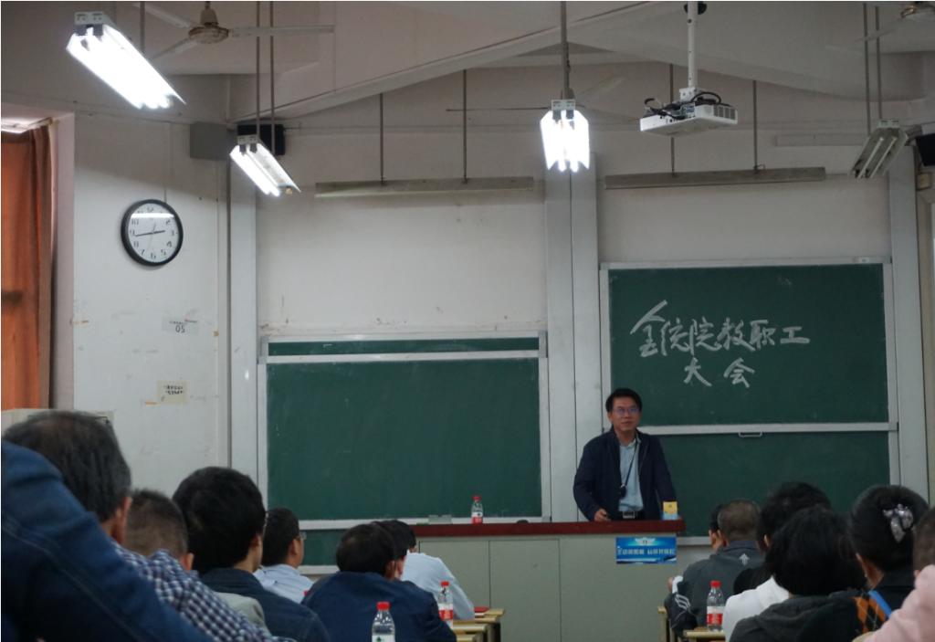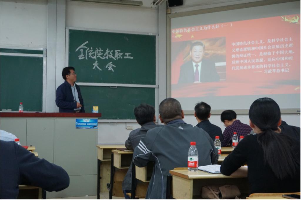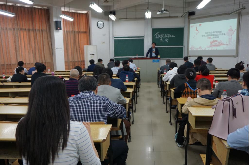 10月8日下午,五楼自拍 在二教召开 “不忘初心,牢记使命”主题教育系列辅导报告会,深入学习习近平总书记在庆祝中华人民共和国成立70周年大会上的重要讲话、开展“不忘初心,牢记使命”主题教育辅导报告之“爱国主义教育”专题教育报告学习及教工党支部改选工作。五楼自拍 领导班子成员、全体教职工参加会议。潘敏院长主持会议。