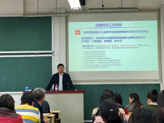 接下来,王修华副院长就近期的科研工作安排展开部署,对“研究阐释党的十九届四中全会精神国家社科重大项目”展开动员, 指出本次会议标志着党对国家制度和国家治理体系的认识升华到一个新高度、新视野、新水平,具有里程碑意义,要求老师们高度重视本次会议精神,基于前期的研究基础,以现实问题为导向,选择相关的研究领域积极开展研究。同时五楼自拍 已全面展开申报意愿摸底调查,点对点通知每一位老师,为老师在文件解读、组建团队、平台交流等方面提供精准服务。再次强调了国家课题申报的时间,要求老师们注意把握时间节点,与五楼自拍 、五楼自拍 合拍共振。
