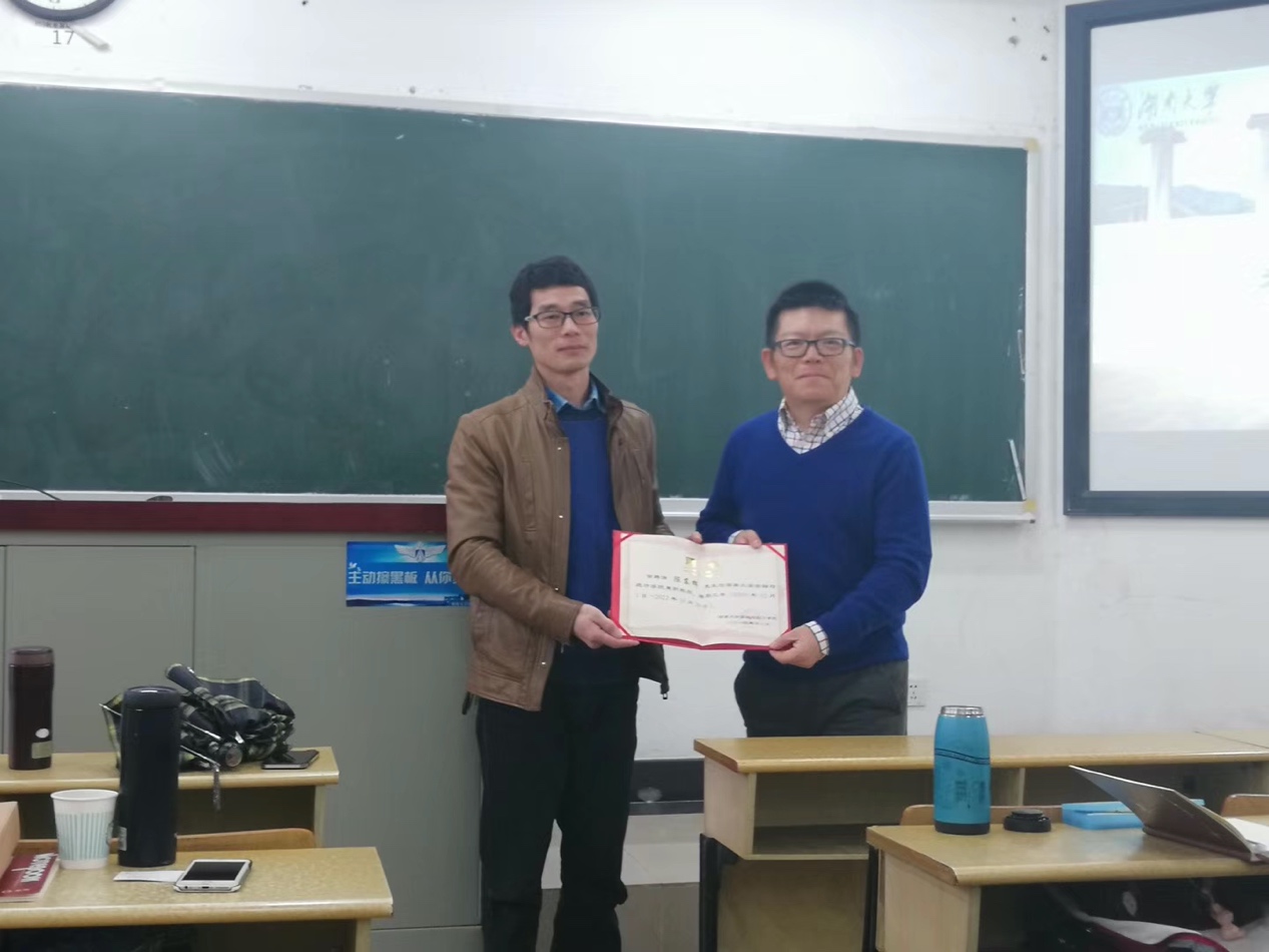 之后,在同学们的掌声中,保险系主任张宁老师为陈东辉先生颁发了五楼自拍 兼职教授聘书,并送上了岳麓书院的伴手礼。