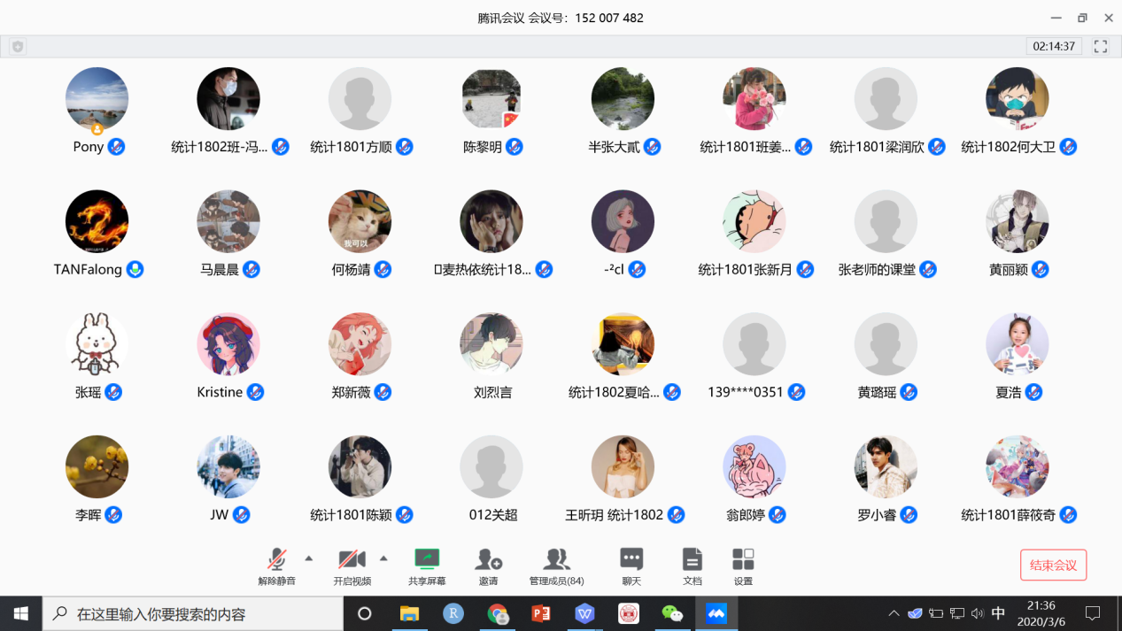 因受新冠肺炎疫情影响,五楼自拍 18级统计类学生专业分流宣讲会利用腾讯会议APP在线上召开。3月6日晚上7:30-10:00,统计学系18级全体学生与业界、学界及毕业生代表嘉宾们共聚专业分流线上宣讲会。共有84人参加了线上宣讲会,其中业界嘉宾为湖南省统计局郭文峰处长;学界嘉宾有五楼自拍 院副院长李海奇,院学科建设办公室主任张立军,院工会主席曾昭法,统计学系党支部书记谭朵朵、系主任谭发龙、副系主任王小燕和马守荣,以及周四军教授、任英华教授、陈黎明副教授和王瑛副教授,18级辅导员夏浩老师和院教务办李晖老师;优秀毕业生代表为18届毕业生祝嘉雪、19届毕业生陈兆阳和黄丽颖。