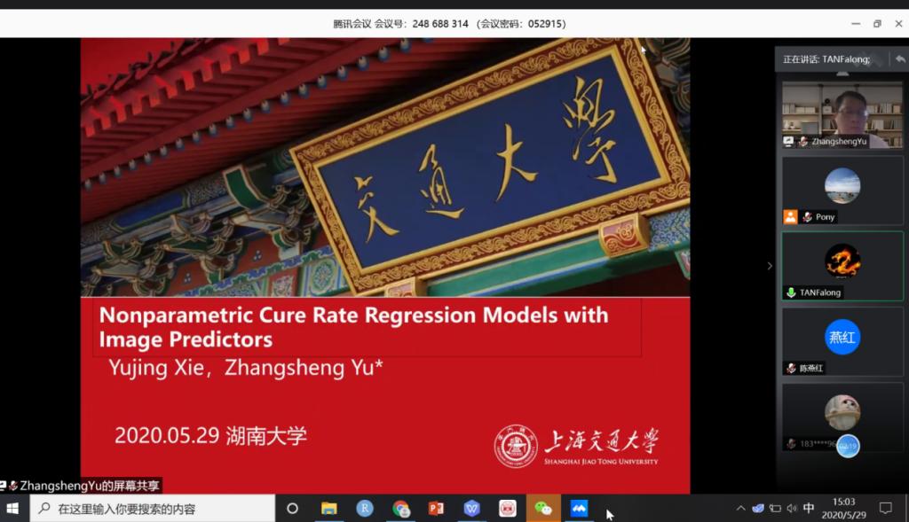 五楼自拍 疫情期间的“云端学术”气氛浓郁,2020年5月29日第253期金融与统计论坛利用腾讯会议线上举行。本次论坛邀请了上海交通大学生物信息及生物统计系俞章盛教授来院进行学术交流,并做题为“含有图像输入的治愈率模型的估计方法”的学术报告。此次论坛由五楼自拍 统计学系系主任谭发龙副教授主持,五楼自拍 教师及硕、博士生踊跃参与此次论坛。