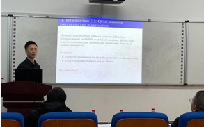 在金融与统计分论坛第三分会场(财院校区3号楼125报告厅),采用线上线下相结合的报告形式,2位统计学科领域博士做了相关研究报告,武汉大学、耶鲁大学联合培养博士、香港浸会大学博士后贺百花女士报告了《Functional Martingale Residual Process for High-Dimensional Cox Regression With Model Averaging》的相关研究,兰卡斯特大学博士刘行先生报告了《Center-outward R-estimation for semiparametric VARMA models》的相关研究。