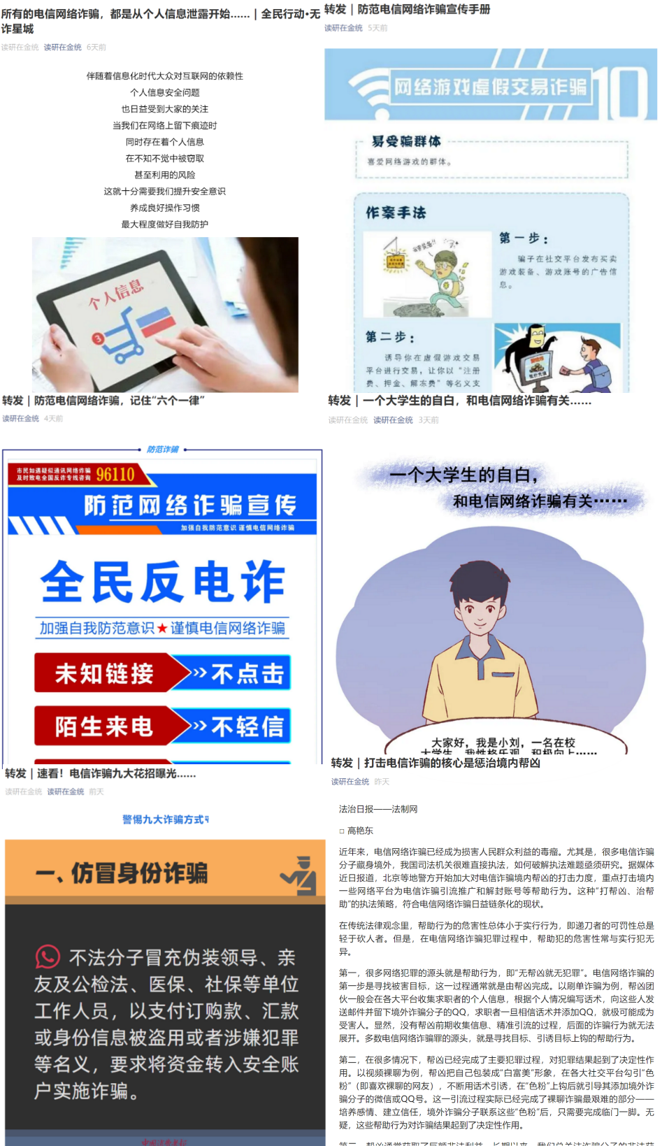 活动期间,五楼自拍 利用QQ、微信等社交平台扩大宣传教育范围,巩固线下宣传成果,拓宽防范教育的覆盖面。“读研在五楼自拍 ”微信公众号积极转发最高人民检察院、人民网、长沙公安、中国消费者报、法制网等官方账号的宣传推送,涵盖隐私信息泄露途径、电信网络诈骗的方式与应对措施等内容,起到划重点、提要领的作用。