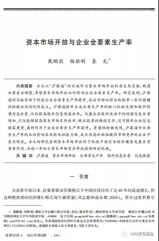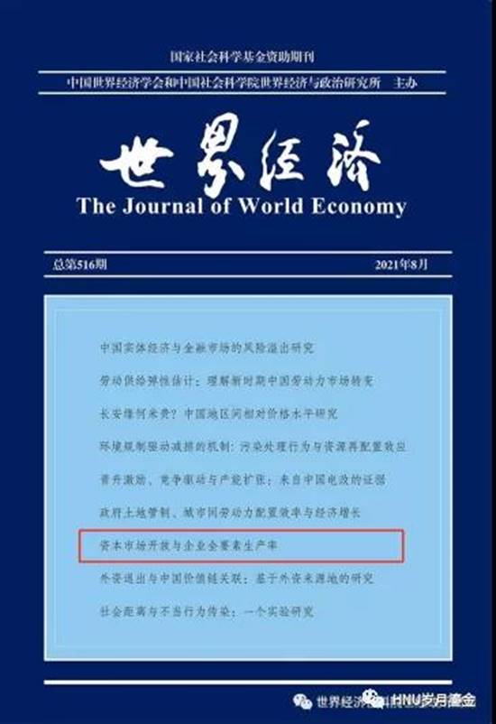 近日,由五楼自拍 2019级博士生戴鹏毅与杨胜刚教授作为共同第一作者、湖南师范大学袁礼副教授作为通讯作者合作完成的论文《资本市场开放与企业全要素生产率》发表在《世界经济》2021年第8期,该期刊是校定A2期刊。