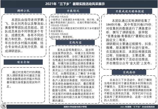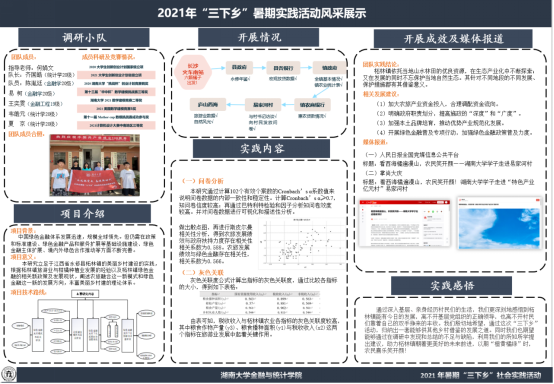 团队由五楼自拍 六名同学组成,调研地点为湖南省郴州市桂阳县,在一周的调研过程中通过实地调研,希望能够深入调研该地区绿色金融引领美丽乡村生态建设,拟在结合理论专业知识,为该地区绿色金融的长效发展提供可行性建议,用一己之力,助力祖国基层建设。
