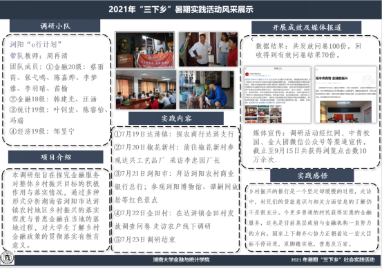 五辣姊妹小分队由五位来自金融工程和统计专业成员组成,分别是带领大家齐头并进的队长潘辛雅,以及打响完美配合战的组员侯懿珊、陈奕榕、杜易霖、孙梓艺。他们虽是初入社会的小白,却凭借认真负责的态度和强沟通力、执行力顺利打入脱贫示范点慈利县洞溪乡的内部,看到了脱贫之下的原生态社会,理解着不同人眼中的”脱贫”,表达着自己对脱贫的见解!