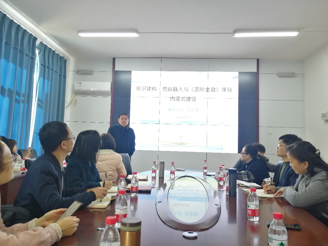 首先,杨胜刚教授进行了主题发言。他指出高等教育已从精英教育阶段进入到普及化阶段。中国教育持续发生深刻变革,作为落实立德树人这一根本任务的重要抓手,课程思政是一项系统性工程,需要全方位、多角度地在各个环节体现思政元素,以培养大学生的政治认同和激发其家国情怀。货币金融系在教学方面一直表现突出,成果丰硕,获得包括国家级精品课程、国家精品资源共享课程、国家级线上线下混合式一流课程等一系列课程建设的国家认证。他鼓励货币金融系新老教师都积极参与课程思政,探索金融专业特色课程思政的方案与模式,顺利实现新老更替,把新鲜血液引入课程思政教学。