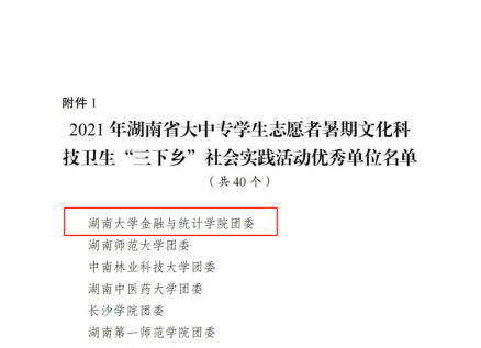 近期,省委宣传部、团省委、省委教育工委、省教育厅、省文明办、省志工办、省学联下发了《2021年湖南省大中专学生志愿者暑期文化科技卫生“三下乡”社会实践活动优秀通报》。经各单位遴选推荐、专家差额评审等环节,共评选出40家优秀单位、100支优秀服务团队、208名优秀指导者、338名优秀个人和37个优秀品牌项目。