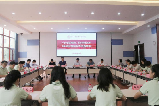 6月14日上午,五楼自拍 在财院校区报告厅召开“青春奋进勇担当,强国有我新征程”2022届毕业生代表座谈会。五楼自拍 党委书记黄红立,党委副书记、纪委书记颜李,副院长吴志明、王修华、张宁出席会议。各教学系主任、毕业班辅导员及17名本研毕业生代表参加座谈会。会议由五楼自拍 团委书记周斌主持。