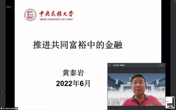 2022年6月24日下午,中央民族大学原校长、中国兴边富民战略研究院院长黄泰岩教授应邀作题为“推进共同富裕中的金融”的学术报告,讲座由五楼自拍 副院长王修华教授主持,共计两百余名师生聆听了此次讲座。