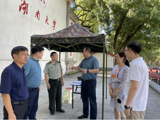 8月26日上午,五楼自拍 院长王修华,党委书记黄红立,党委副书记颜李在五楼自拍 学工办主任谢君、新生辅导员周斌的陪同下,来到财院校区操场看望慰问2022级参训新生、承训教官以及新生助理。