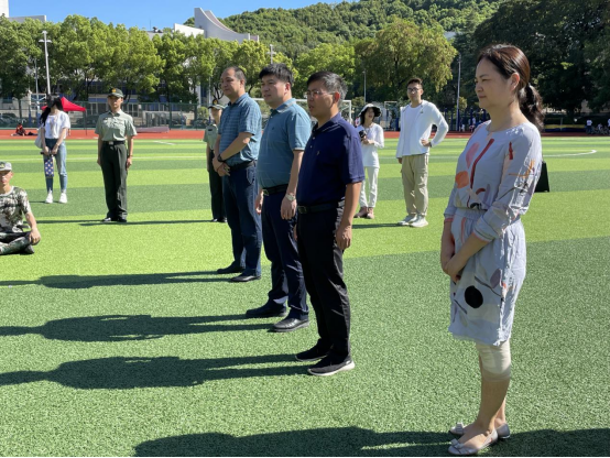 军训场上,新生们各个目光灼灼,风姿飒爽。王修华在绿茵场上驻足,他强调身体素质是今后学习与生活的基础,希望新生们可以通过军训磨练自己的意志,尽快适应大学生活,并对新生们的训练状态表示肯定。