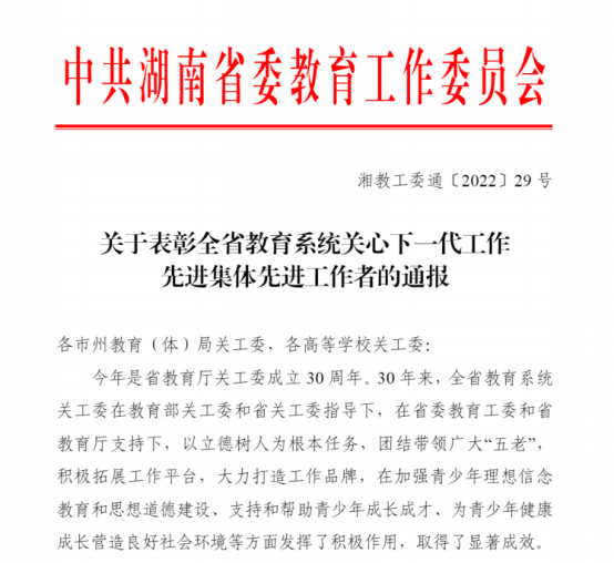 日前,中共湖南省委教育工委印发《关于表彰全省教育系统关心下一代工作先进集体先进工作者的通报》,表彰了一批全省从事关心下一代工作的先进集体和个人。五楼自拍 关工委荣获全省教育系统关心下一代工作先进集体荣誉称号,宋光辉老师荣获全省教育系统关心下一代工作先进工作者荣誉称号。