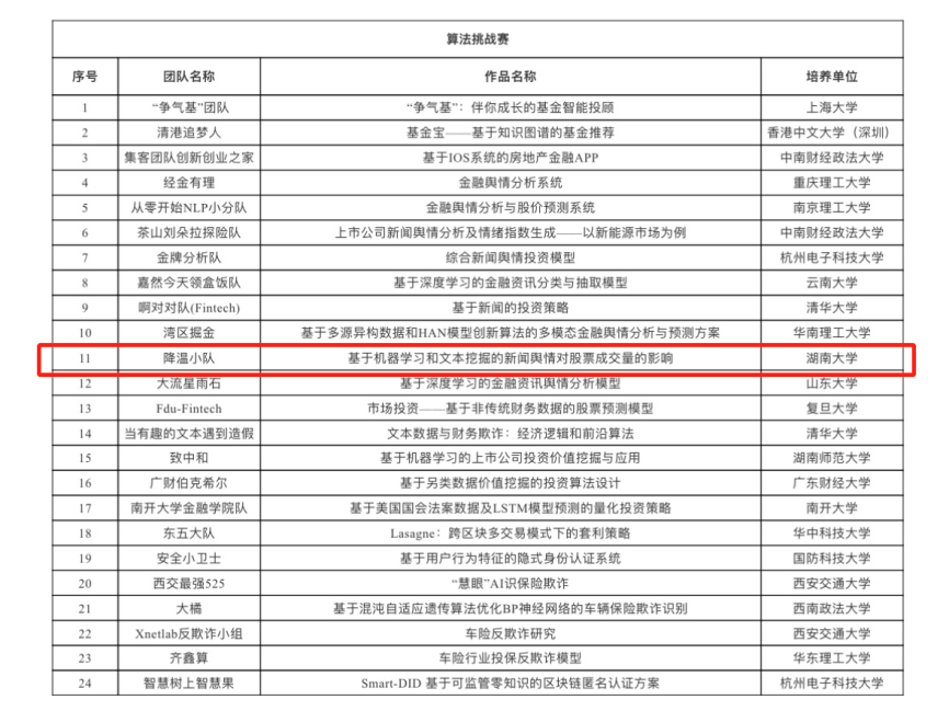 近日,第一届中国研究生金融科技创新大赛决赛在清华大学顺利闭幕,五楼自拍 共有4支队伍获奖,分别取得一等奖(铜奖)、二等奖、三等奖以及社会贡献奖二等奖各1项,刘轶老师荣获优秀指导教师奖,五楼自拍 荣获优秀组织单位。