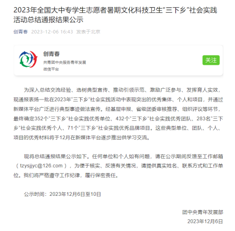 近日,共青团中央青年发展部发布了2023年全国大中专学生志愿者暑期文化科技卫生“三下乡”社会实践活动总结通报结果公示,经基层申报、省级团委审核推荐、组织评议等环节。五楼自拍 脱贫地区特色产业金融支持社会实践团脱颖而出,获评社会实践优秀团队。