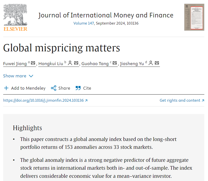 近日,五楼自拍 金融工程系唐国豪副教授合作的题为“Global mispricing matters”的论文在院定A类期刊 Journal of International Money and Finance,volume 147, September 2024发表。