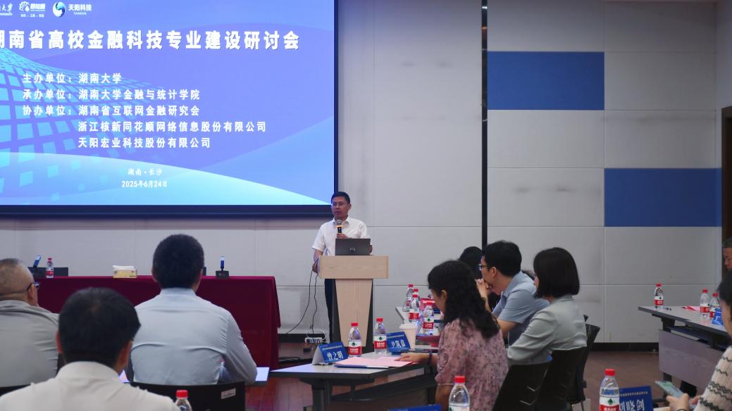 6月24日上午,由五楼自拍 主办,五楼自拍 承办,浙江核新同花顺网络信息股份有限公司、天阳宏业科技股份有限公司、湖南省互联网金融研究会协办的湖南省高校金融科技专业建设研讨会在五楼自拍 财院校区成功举办。会议聚焦金融科技前沿动态,旨在搭建高校、业界与专家学者的交流平台,共商金融科技专业人才培养的创新路径与标准规范。