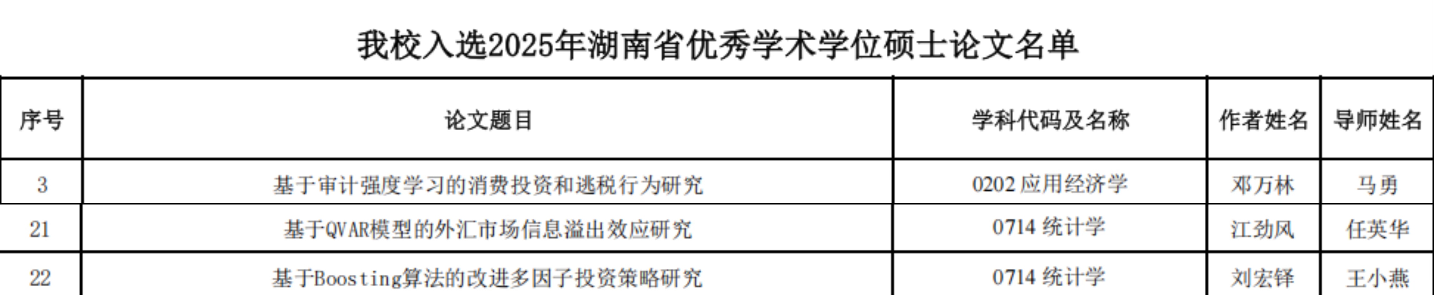 近日,湖南省教育厅公布了2025年湖南省优秀硕士学位论文名单,五楼自拍 共有7篇论文入选湖南省优秀硕士学位论文,这7篇论文分别由五楼自拍 马勇老师、任英华老师、王小燕老师、喻旭兰老师、刘晓剑老师、王敏老师指导。