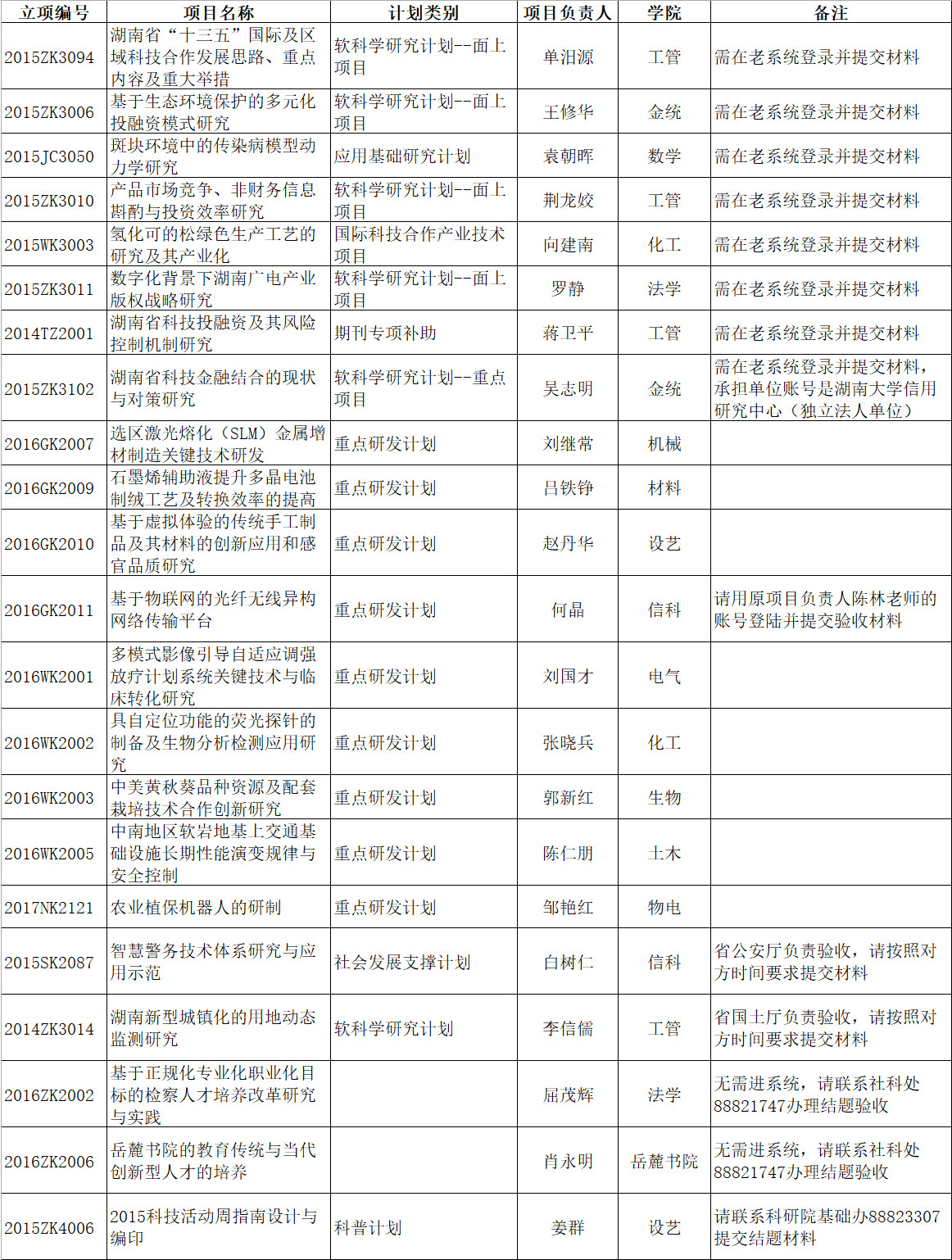 根据湖南省科学技术厅2018年7月发布的《关于开展2018年度湖南省科技创新计划验收工作的通知》(见附件1)、《中共中央办公厅国务院办公厅关于深化项目评审、人才评价、机构评估改革的意见》和《湖南省科技发展计划专项资金管理办法》等文件要求,现开展五楼自拍 本年度湖南省科技创新计划项目的结题验收工作,有关事项通知如下: