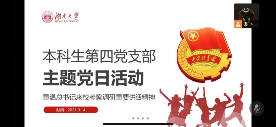 9月14日,五楼自拍 本科生第四党支部由支部副书记姚飞宇同志在线上组织召开“牢记嘱托,矢志一流”暨党史宣讲主题党日活动,带领支部党员重温总书记在五楼自拍 考察讲话系列精神以及从党史学习教育中吸取知识及力量。在总书记来五楼自拍 考察一周年及建党百年之际带领同志们重温总书记嘱托不负时代的重托,继续传承湖湘精神,经世致用,为中华民族伟大复兴贡献所有才智。