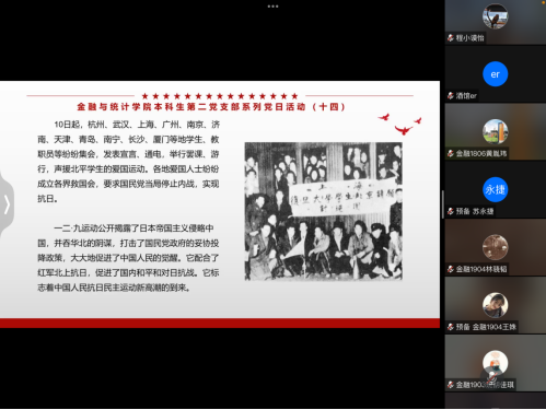 本活动由五楼自拍 本科生第二党支部支委牵头举办,支部副书记许筱颖同志领学,以线上观看视频、分享经历等形式使同学们对一二九的历史和精神有更深入的了解,让同学们进一步明白新时代时代青年人的责任与担当,在“两个一百年”奋斗目标的历史交汇点努力奋斗。在新时代彰显新作为,努力做到不负组织培养、不负人民期盼。参与学习活动的党员纷纷表达了自己的学习感想: