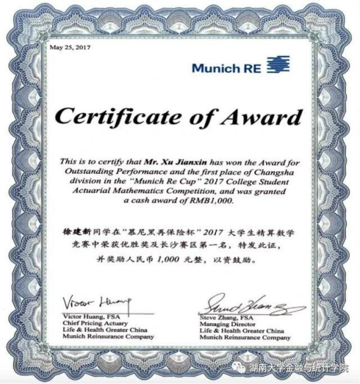 在保险专业学习的四年时光,徐建新专注于精算考试,大二、大三期间通过了中国精算考试和北美精算考试的基础课程。良好的精算基础助力他在慕尼黑再保险杯2017精算数学竞赛中拿到了长沙赛区第一名,全国第五名的成绩。