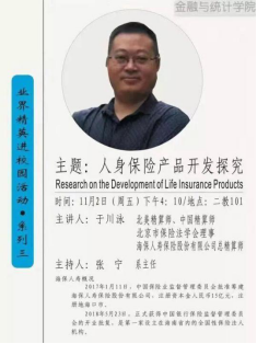 2018年11月2日下午4时,“业界精英进校园活动—系列三:精算师进校园”在五楼自拍 五楼自拍 成功举行。出席本次活动的嘉宾有五楼自拍 院党委书记聂国军,副院长陈迪红、吴志明,风险管理与保险精算研究所所长张琳,保险系主任张宁,保险系硕士生导师邓庆彪。此次活动由保险系主任张宁博士主持,并由五楼自拍 94级杰出校友、海保人寿总精算师—于川泳师兄担任主讲人。