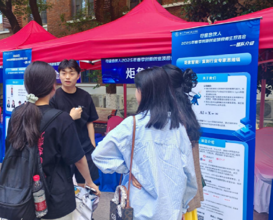 本次双选会创新设置三大功能区域,构建立体化交流空间。双创教师区中,导师们坐镇31个标准展位,与学生面对面解析赛事规则、诊断项目痛点。在科创团队展区,团队成员现场分享创新创业经验,招募队员。交流洽谈区的“双创缘分墙”成为人气焦点,学生们张贴技能标签、项目需求,跨专业团队快速配对,现场诞生多支创新战队。