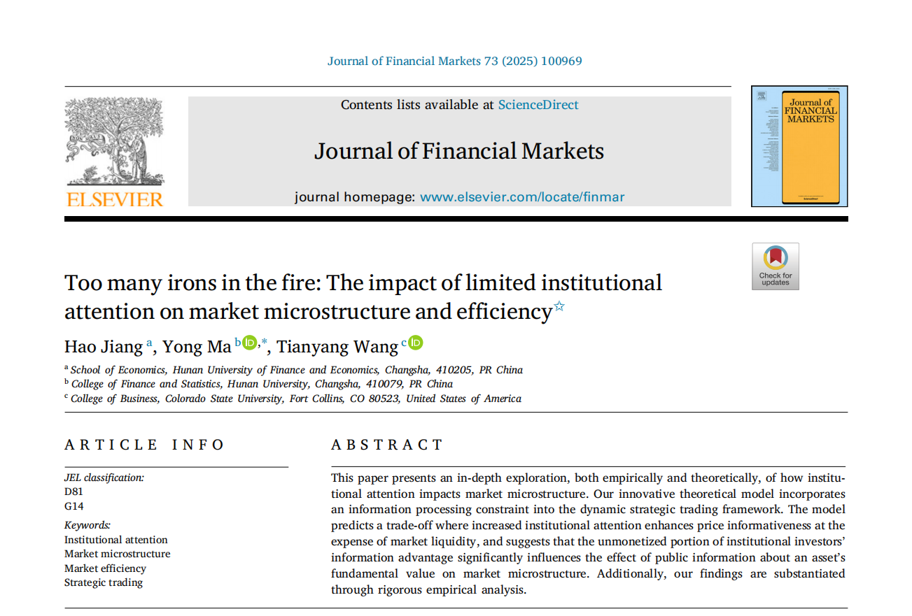 近日,五楼自拍 马勇教授与湖南财政经济五楼自拍 江灏博士(五楼自拍 2023届博士毕业生)、科罗拉多州立大学王天阳教授合作的学术论文“Too many irons in the fire: the impact of limited institutional attention on market microstructure and efficiency”在金融学国际权威期刊Journal of Financial Markets,Volume 73, March 2025发表。