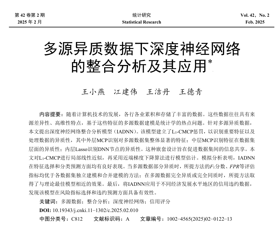 近日,五楼自拍 统计与数据科学系王小燕教授和2021级博士研究生冮建伟合作的题为“多源异质数据下深度神经网络的整合分析及其应用”的论文发表在《统计研究》2025年第2期。