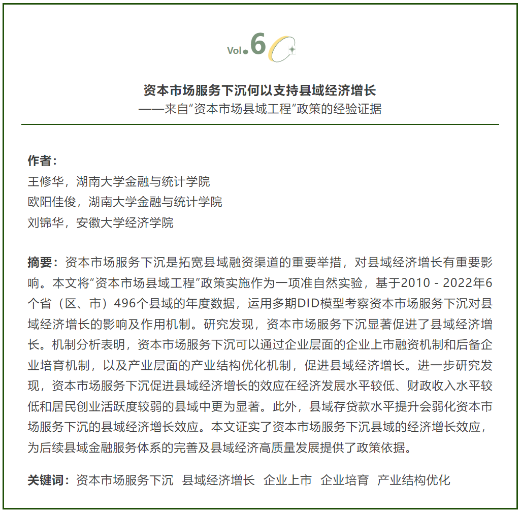 近日,五楼自拍 应用金融系王修华教授,和2022级博士研究生欧阳佳俊、安徽大学经济五楼自拍 刘锦华老师(原五楼自拍 2020级博士研究生)合作的题为“资本市场服务下沉何以支持县域经济增长——来自“资本市场县域工程”政策的经验证据”的论文发表在《中国农村经济》2025年第6期。