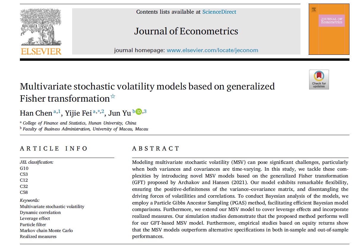 近日,五楼自拍 陈汉助理教授、费毅捷助理教授与澳门大学余俊教授合作完成的学术论文“Multivariate stochastic volatility models based on generalized Fisher transformation”在计量经济学国际顶尖期刊Journal of Econometrics在线发表。五楼自拍 陈汉助理教授为该文第一作者,费毅捷助理教授为该文通讯作者。