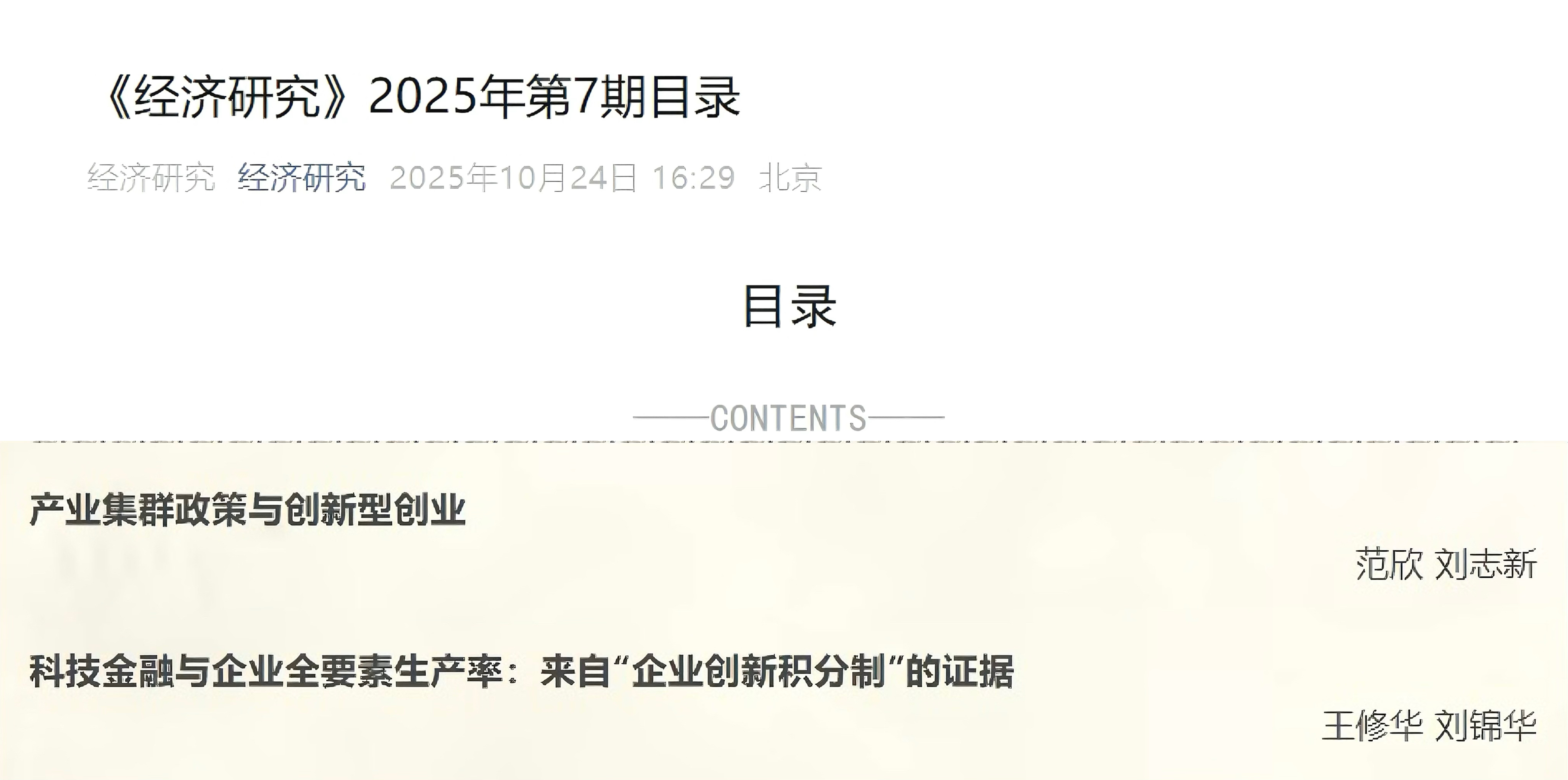 近日,五楼自拍 应用金融系王修华教授和安徽大学经济五楼自拍 刘锦华老师(原五楼自拍 2020级博士研究生)合作的题为“科技金融与企业全要素生产率:来自企业创新积分制的证据”的论文发表在《经济研究》2025年第7期。